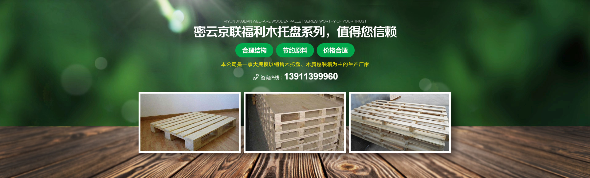 北京京聯(lián)國(guó)順木制品有限公司 (原北京市密云縣京聯(lián)福利木制品廠)成立于1993年,位于北京市密云縣西田各莊鎮(zhèn)蒼頭村,占地約5000平米。我公司工廠是一家大規(guī)模以銷售木托盤為主的生產(chǎn)廠家。本工廠是一家直接采購(gòu)原木,按客戶要求生產(chǎn)規(guī)格尺寸的托盤,我公司工廠位于河北省承德市有著木材加工點(diǎn),可以做到,從山上的木頭下山到客戶手中的托盤都是一手貨,減少了中間商的費(fèi)用,所以我公司售出的產(chǎn)品對(duì)北京這個(gè)龐大的市場(chǎng)來(lái)說在同樣的規(guī)格尺寸的托盤來(lái)說價(jià)格比較占優(yōu)勢(shì)。